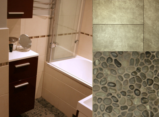 Wykonaliśmy łazienkę gdzie ciekawym elementem wnętrza była podłoga z mozaiki (kamieni) otoczaków połączona z szarym gresem.